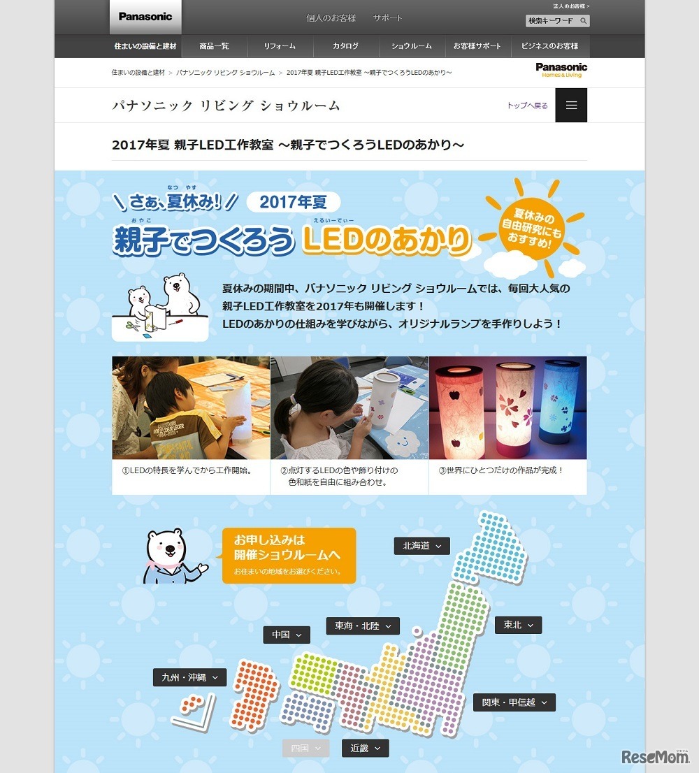 パナソニックは、親子で楽しめるLED工作教室「さぁ、夏休み!親子でつくろうLEDのあかり」を7月22日より全国22か所のパナソニックリビングショウルームで開催する。事前申込制で、申込方法は開催地により異なる。