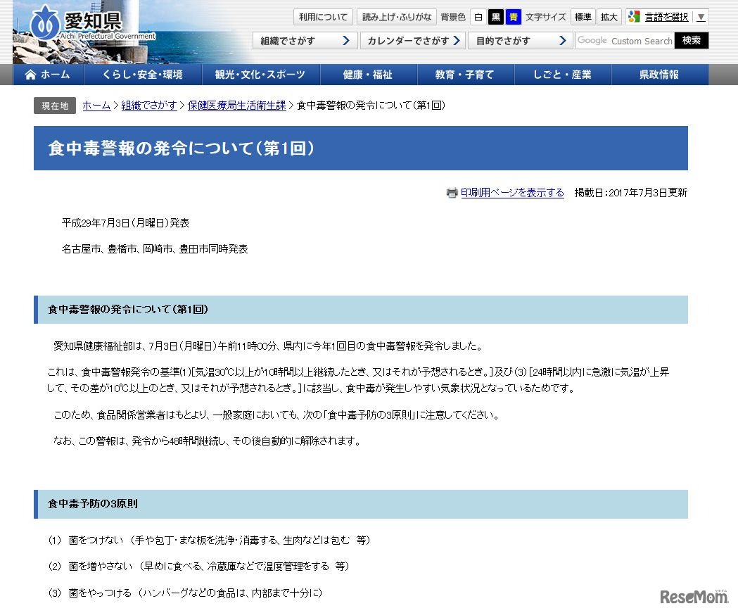 愛知県健康福祉部は7月3日、食中毒警報を発令した。2017年の発令はこれが初めて。食中毒が発生しやすい気象状況となっていることから、食中毒予防3原則を掲げ予防に務めるよう呼びかけている。