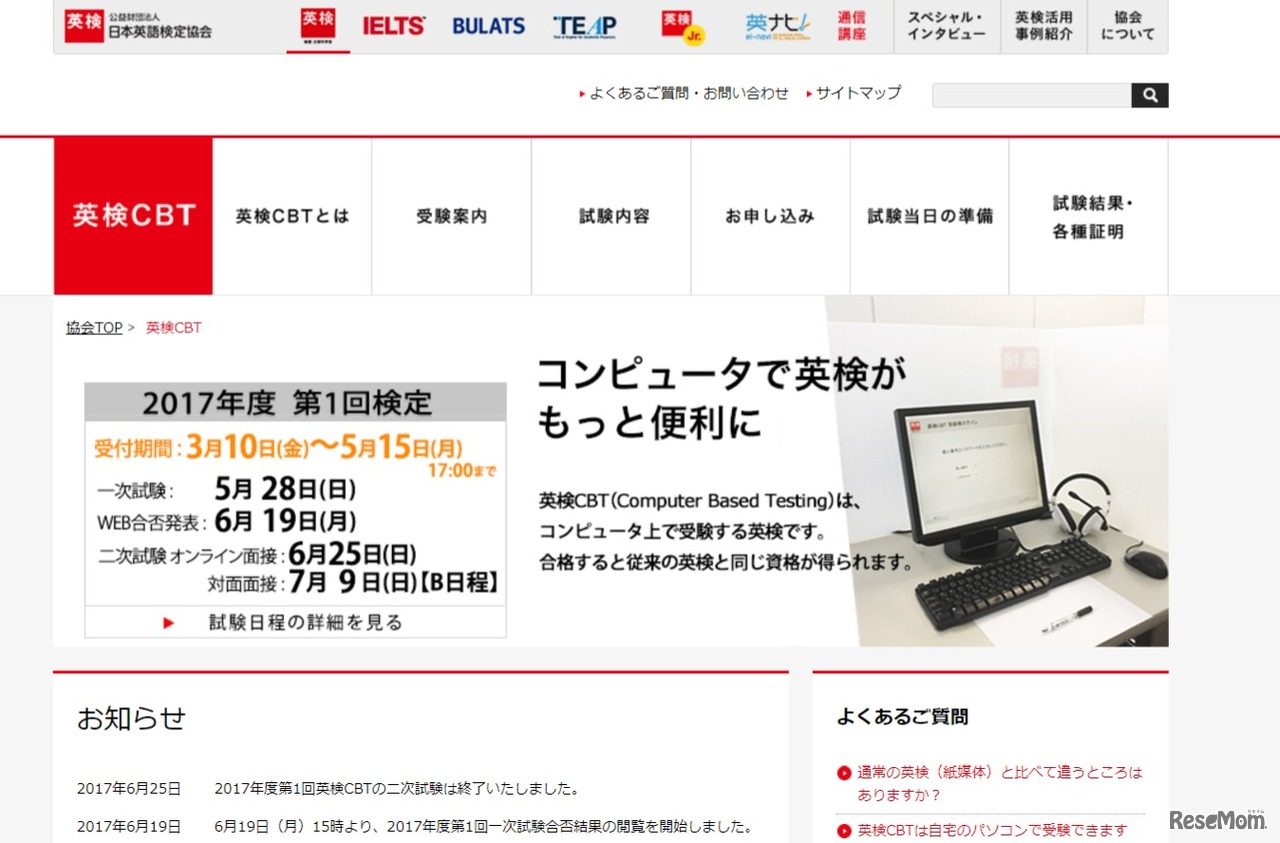 日本英語検定協会(英検協会)は7月4日、2018年度からの「実用英語技能検定4技能CBT」運用開始を速報として発表した。志願者全員の「読む」「聞く」「書く」「話す」の4技能を1日で測定する検定で、新方式に移行後、現行の「英検CBT」を終了する。