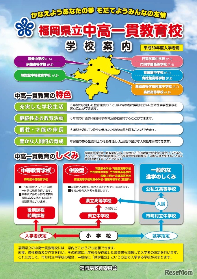 福岡県教育員会は、県立中高一貫教育校の教育活動の特色などを掲載した平成30年度入学者用パンフレットを作成した。中高一貫教育の特色や仕組みのほか、各校の教育内容、入学者決定までのスケジュールなどを掲載している。