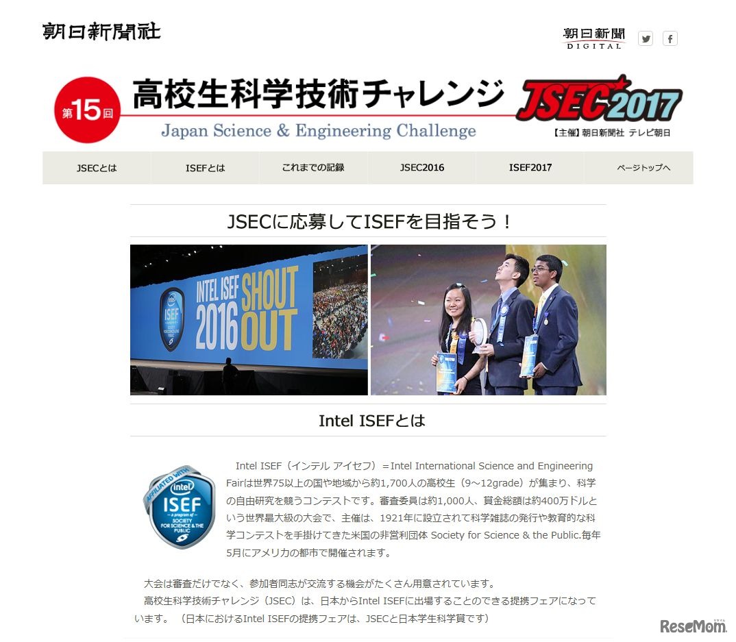 朝日新聞社とテレビ朝日は、科学技術の自由研究コンテスト「第15回高校生科学技術チャレンジJSEC2017」の作品を9月1日から10月2日まで募集する。対象は高校生・高等専門学校生の個人または3名までのチーム。上位入賞者は米国で開催される国際大会へ派遣される。