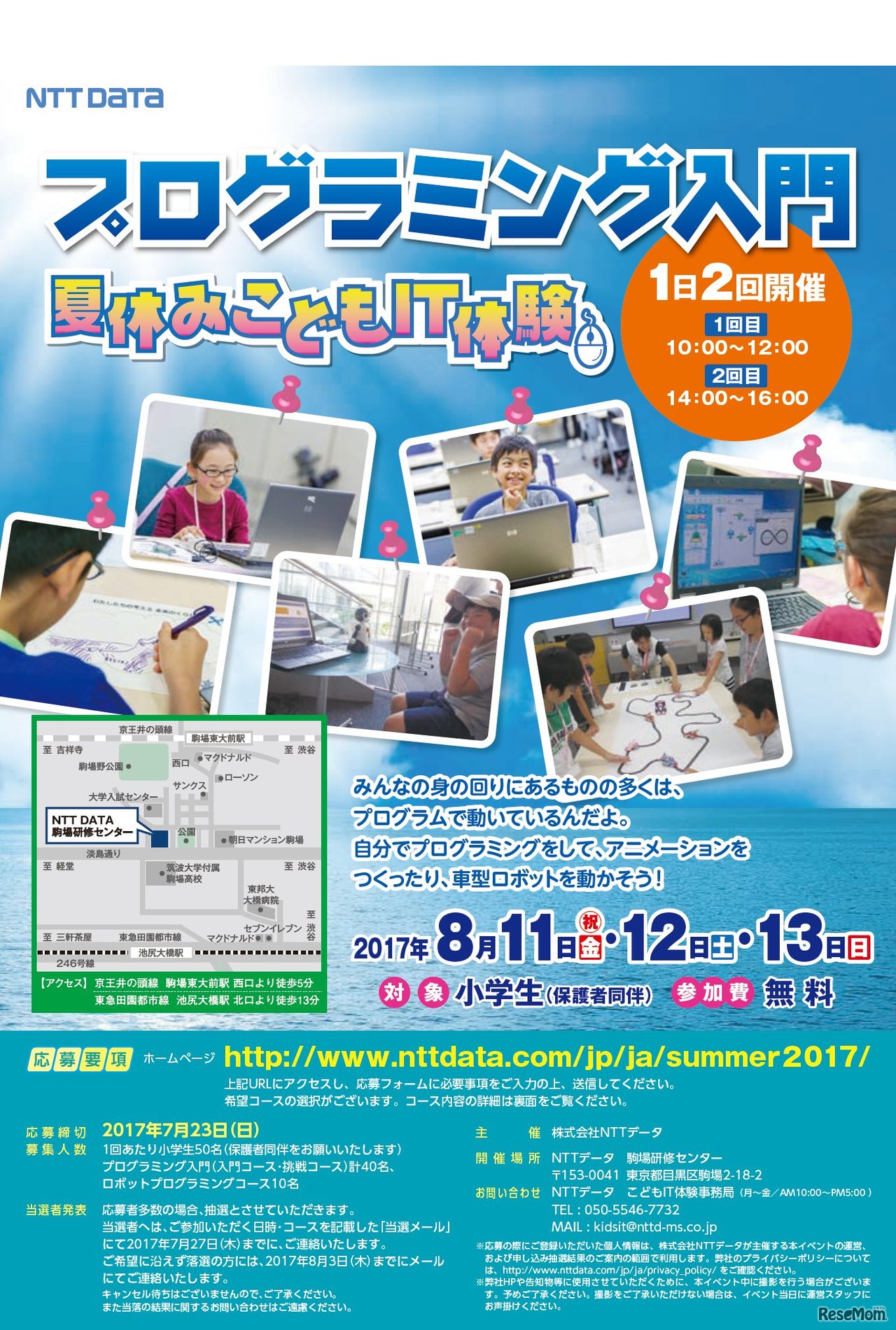 NTTデータは、小学生と保護者を対象としたプログラミング入門イベント「夏休みこどもIT体験」を、8月11日~13日の3日間、NTTデータ駒場研修センターで開催する。参加費は無料。7月23日までWebサイトで申込みを受け付ける。