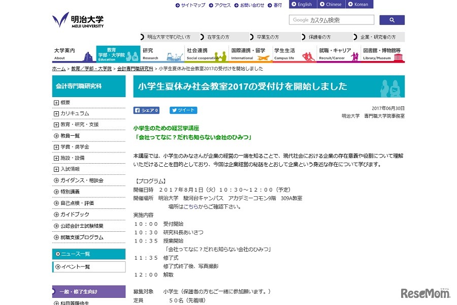 明治大学会計専門職研究科は8月1日、夏休み社会教室「小学生のための経営学講座」を駿河台キャンパスのアカデミーコモンで開催する。対象は小学生で、保護者同伴で参加する。参加費用は無料。申込みは、メールにて先着順で受け付けている。
