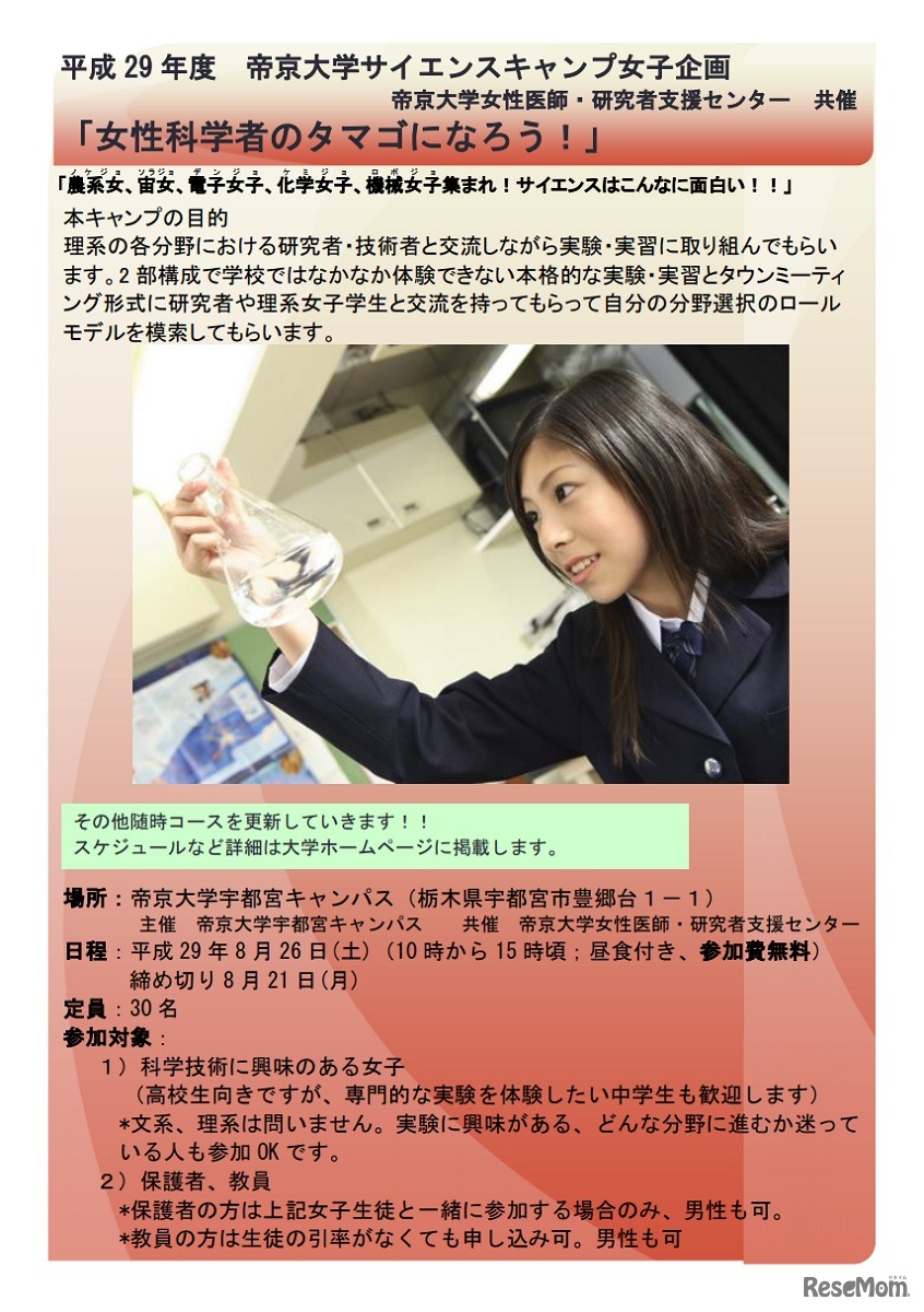 帝京大学は8月4日と26日、「平成29年度帝京大学サイエンスキャンプ女子企画」を開催する。理工系の大学生や研究者と交流しながら、入浴剤作りや神経細胞の観察などの実験、実習に取り組む。対象は、科学技術に興味のある女子中高生。要予約、参加費無料。