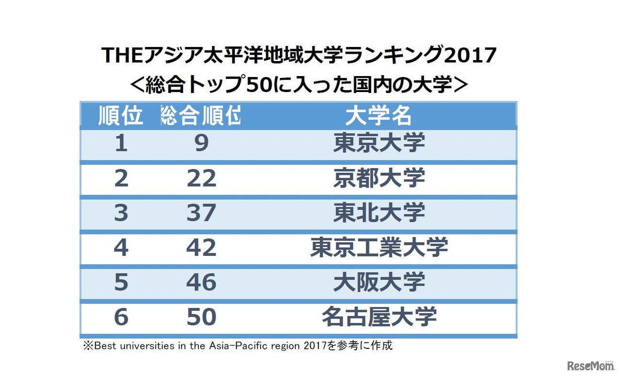 英タイムズ・ハイヤー・エデュケーション(Times Higher Education、THE)は7月4日(現地時間)、初の発表となる「アジア太平洋地域の大学ランキング2017(THE Asia-Pacific University Rankings 2017)」を発表した。