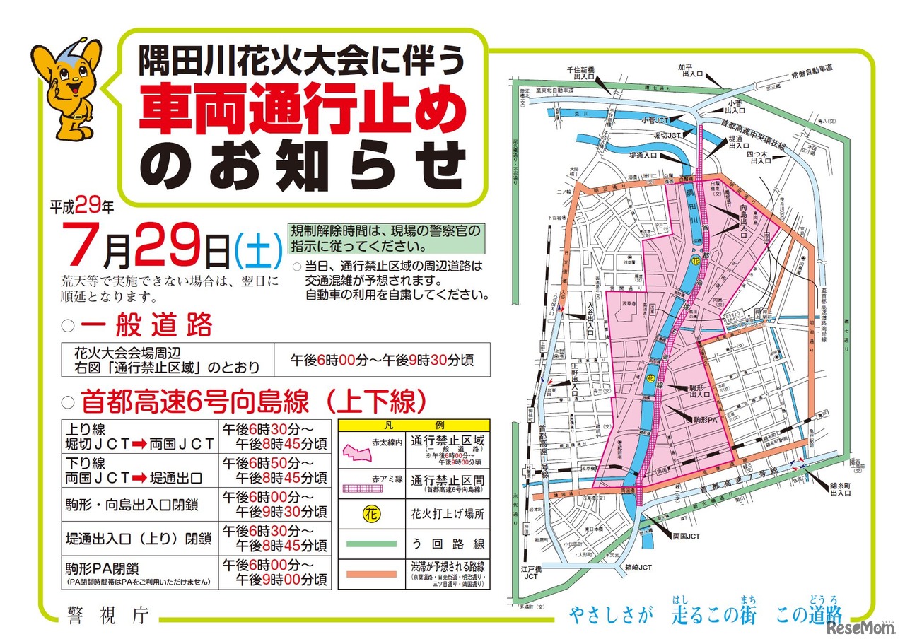 7月29日(土)は第40回隅田川花火大会。大会開催にあわせ、警視庁は当日午後6時から9時半ごろまで、花火大会会場周辺の一般道路で車両通行止めを行う。同時に、首都高速6号向島線でも車両通行止めや出入り口封鎖など、交通規制を行う予定。