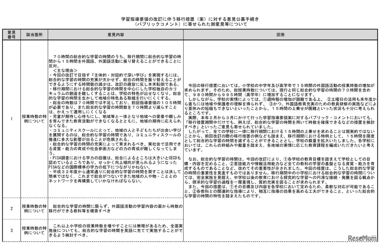 文部科学省は7月7日、小学校学習指導要領、中学校学習指導要領の改訂に伴う移行措置案に対する意見公募手続(パブリック・コメント)の結果を公示した。計1,246件の意見があり、おもな意見の概要とそれに対する文科省の考え方を公表している。