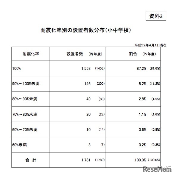 文部科学省は7月7日、平成29年度公立学校施設の耐震改修状況フォローアップ調査の結果を公表した。平成29年4月1日現在、耐震化が未実施の建物は1,399棟、前年度から829棟の減少となった。屋内運動場など、吊り天井の落下防止対策実施率も上昇している。