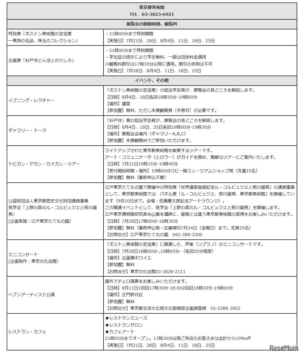 東京都は夏休み期間中の金曜日に、都立美術館・博物館の開館時間を午後9時まで延長する「サマーナイトミュージアム」を実施する。夜の特別イベントや、夜間限定の観覧料割引などの特典も用意されている。