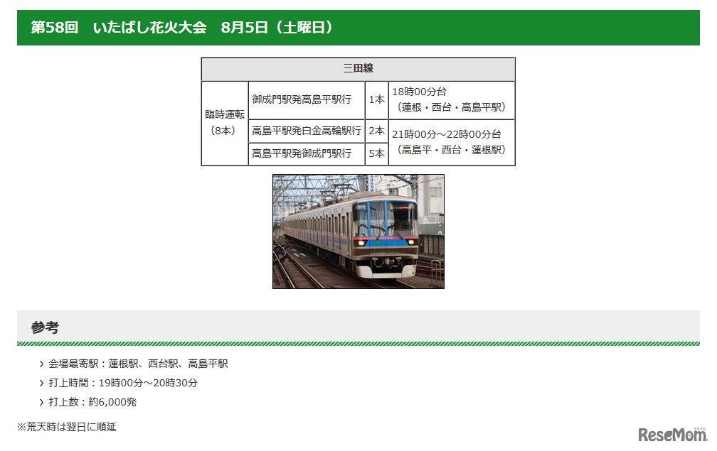 東京都交通局は7月12日、平成29年度(2017年度)の花火大会に伴う臨時列車の運行などについて公開した。対象は第39回 足立の花火、第40回 隅田川花火大会、第58回 いたばし花火大会、第42回 江戸川区花火大会、2017 神宮外苑花火大会。