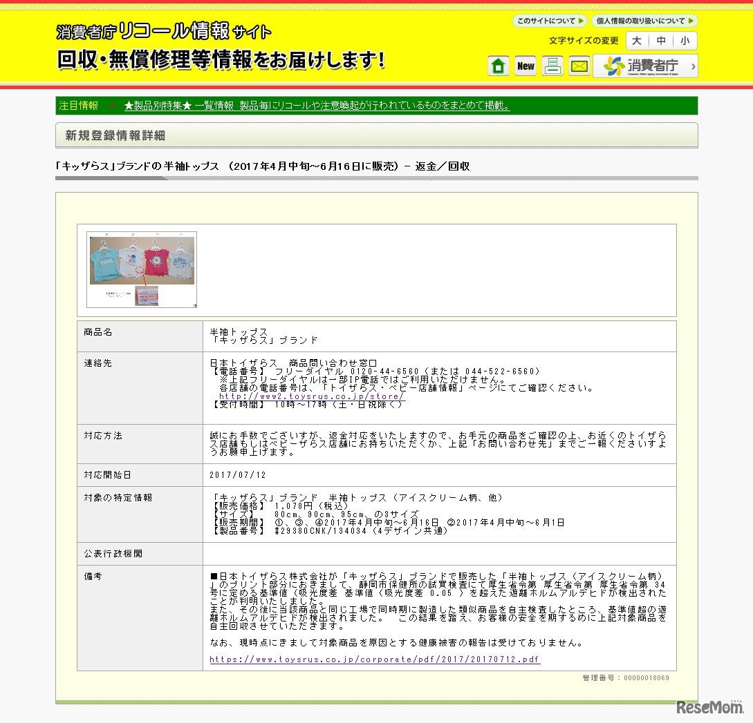 消費者庁は7月12日、日本トイザらスが展開する「キッザらス」ブランドの半袖トップスの一部のリコールを発表した。対象は「キッザらス」ブランドの衣類「半袖トップス(アイスクリーム柄)」。回収は製品の一部から基準値を超えた遊離ホルムアルデヒドが検出されたため。