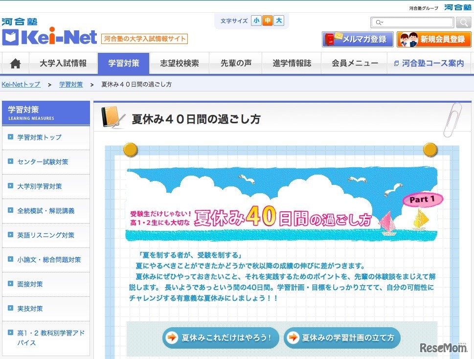 河合塾は大学入試情報サイト「Kei-Net」にて「夏休み40日間の過ごし方」を公開した。「夏を制する者が、受験を制する」として、夏休みにやっておきたいこと、それを実践するためのポイントを先輩の体験談をまじえて解説。受験生だけでなく高1・2生にも大切なことを伝える。