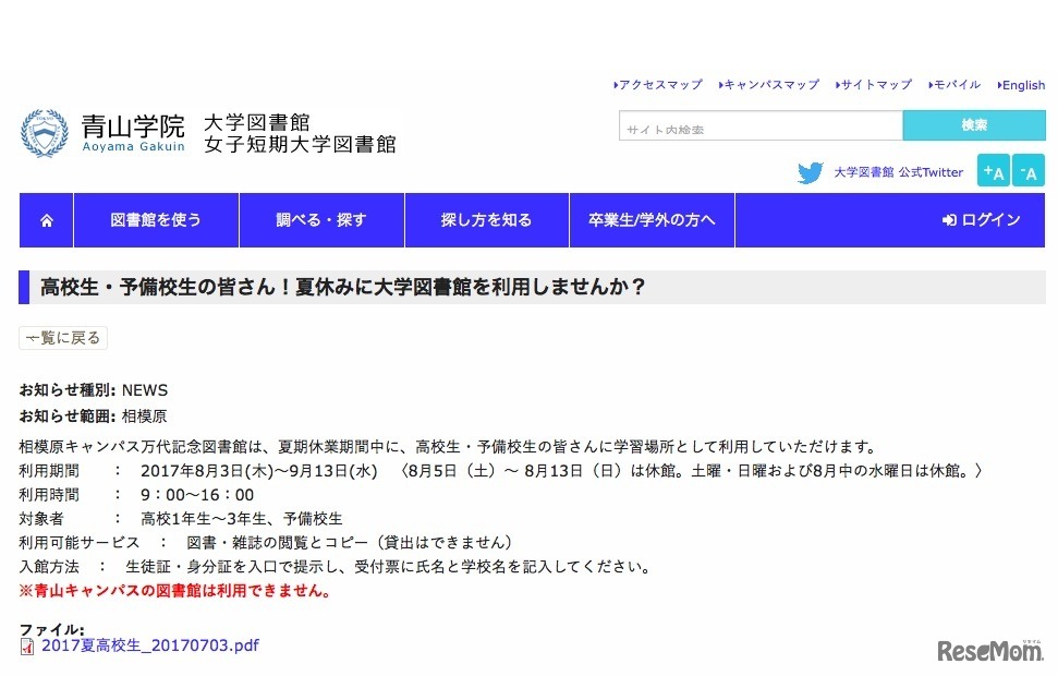 青山学院図書館「高校生・予備校生の皆さん!夏休みに大学図書館を利用しませんか?」