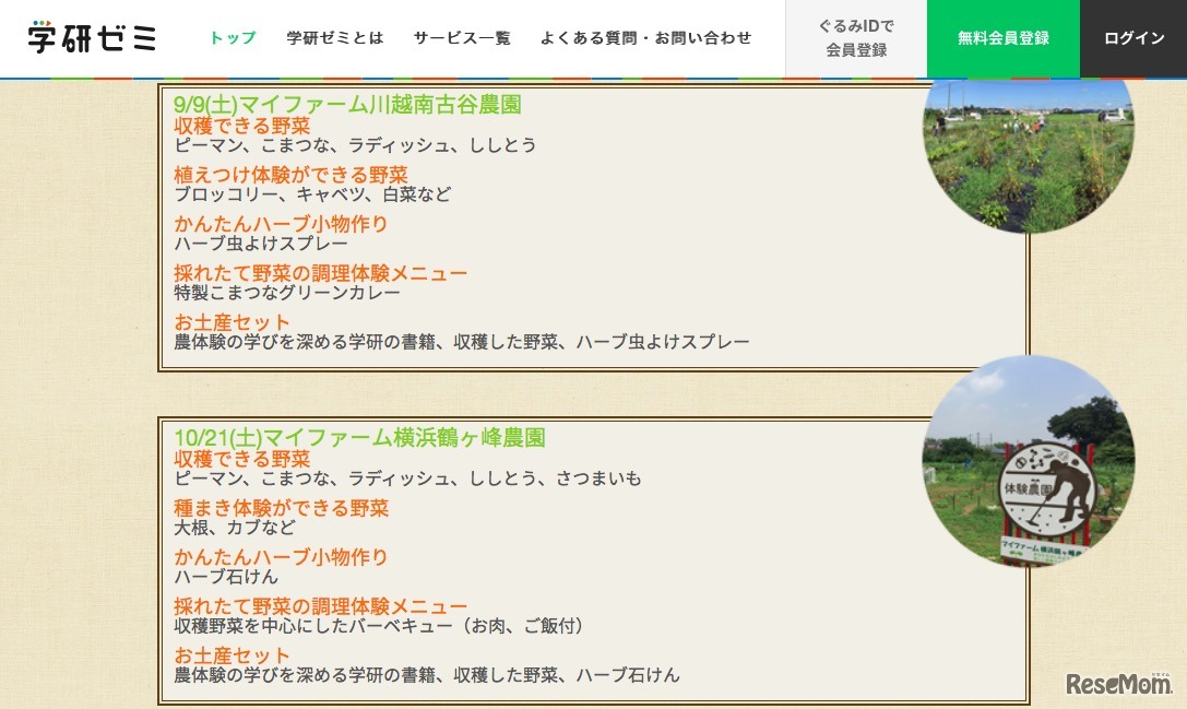 学研教育アイ・シー・ティーが提供する、熱中できるまなびのポータルサイト「学研ゼミ」は、親子で参加できる新たな体験サービス「親子でふれあい農体験」を開催する。9月9日は川越・南古谷農園にて、10月21日は横浜・鶴ヶ峰農園にて、各回30名程度を募集する。