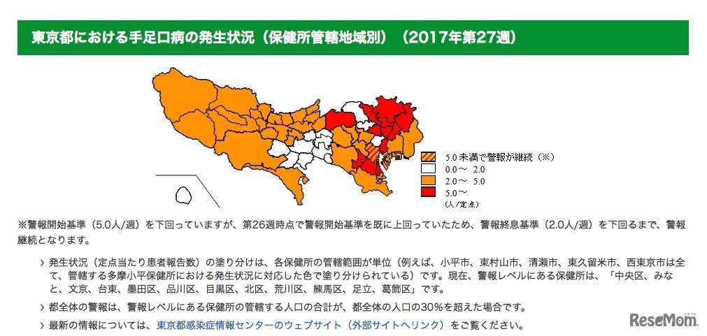 東京都福祉保健局は7月13日、毎年夏に小児を中心に流行する感染症「手足口病」「ヘルパンギーナ」「咽頭結膜熱(プール熱)」の患者報告数が増加しているとして注意喚起を行った。特に手足口病は第27週における患者報告数が、都の警報基準を超え、大きな流行となっている。