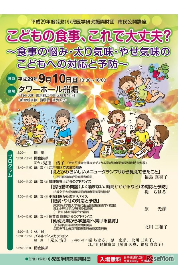 小児医学研究振興財団は、市民公開講座「子どもの食事、これで大丈夫?~食事の悩み・太り気味・やせ気味の子どもへの対応と予防~」を9月10日にタワーホール船堀で開催する。入場無料で事前申込みが必要。