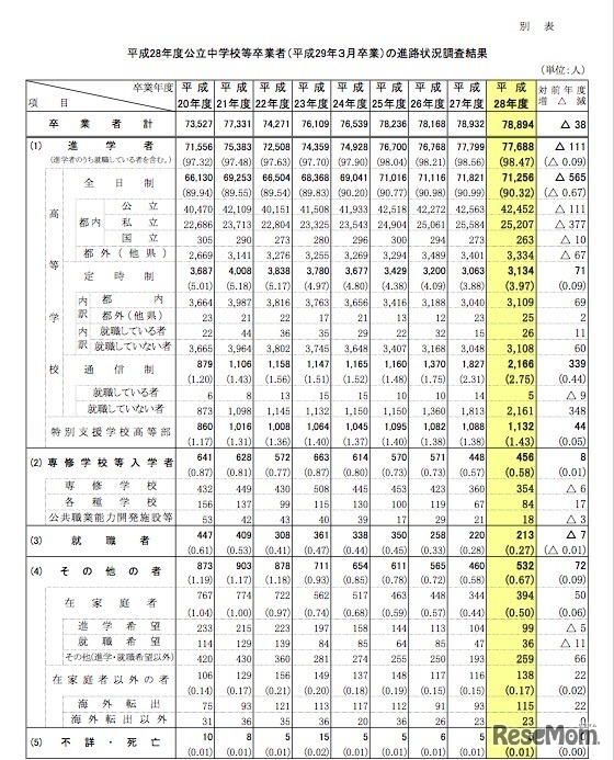 東京都教育委員会は7月13日、平成28年度公立中学校等卒業者(平成29年3月卒業)の進路状況調査の結果(速報値)について公表。進学者は7万7,688人(98.47%)で、前年度7万7,799人(98.56%)と比べ111人減少し、進学率も0.09ポイント減少した。