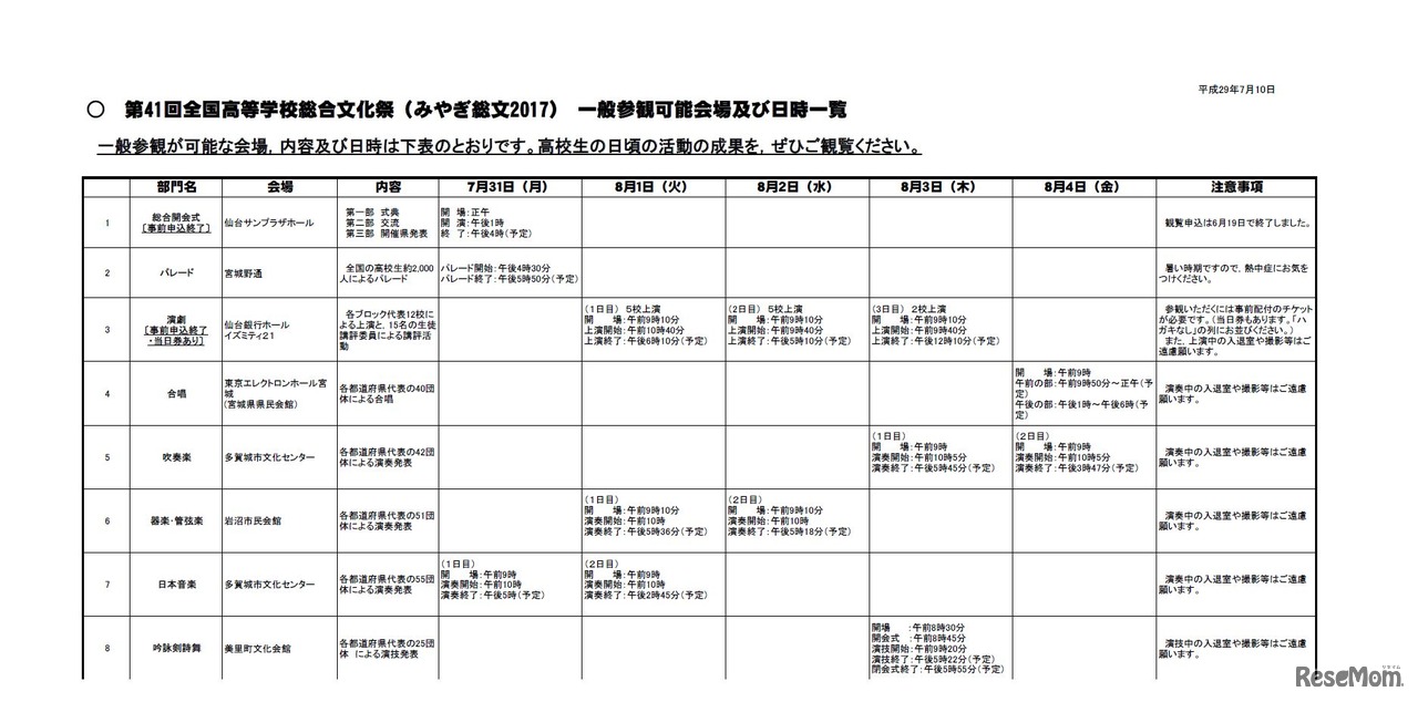 みやぎ総文2017 一般参観可能会場および日時一覧