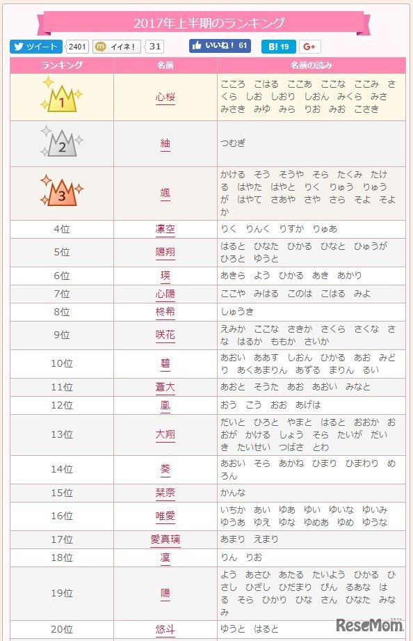 スマートフォン向けアプリ「赤ちゃん名づけ」を提供するリクスタは、2017年上半期赤ちゃん名づけトレンドを発表した。1位「心桜」、2位「紬」、3位「颯」で、Top10に漢字1文字の名前が4つランクインした。