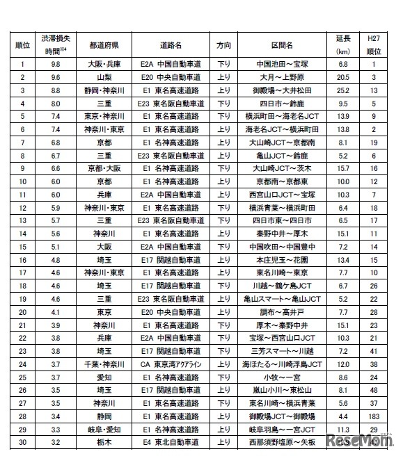 国土交通省は7月14日、平成28年の「お盆期間の渋滞ランキング」を発表した。高速道路では「中国道(下り)中国池田~宝塚」、都市高速道路では「神戸線(上り)第二神明接続部~西宮JCT」、直轄道路では「国道16号 さいたま市 丸ケ崎交差点~宮ケ谷塔交差点」が1位だった。