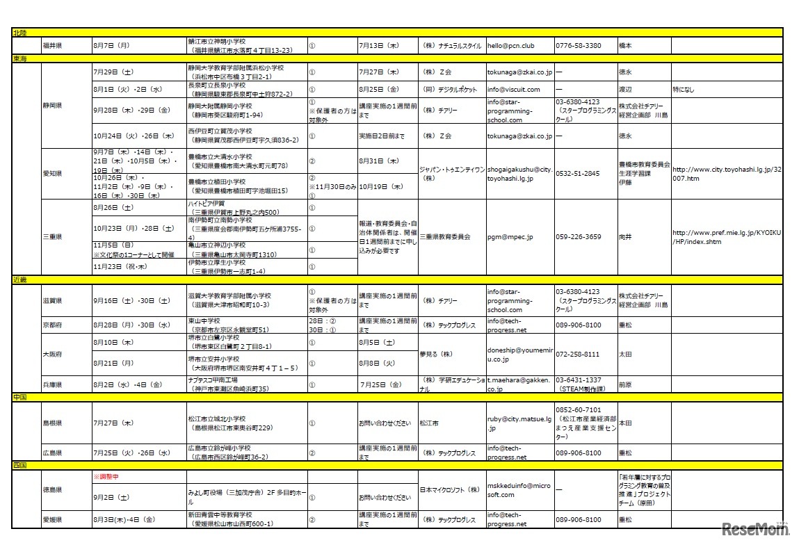 第2次補正予算「若年層に対するプログラミング教育の普及推進実証事業」公開講座日程(北陸~四国)