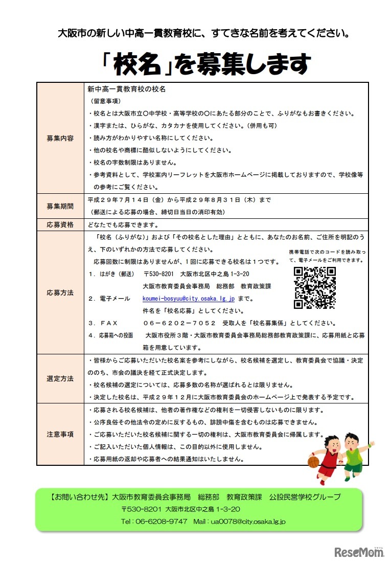 大阪市教育委員会は、2019年4月に開校予定の中高一貫教育校の校名を募集する。漢字またはひらがな、カタカナを使用した、読み方がわかりやすい名称であること。応募資格は誰でも可。募集期間は、7月14日から8月31日まで。