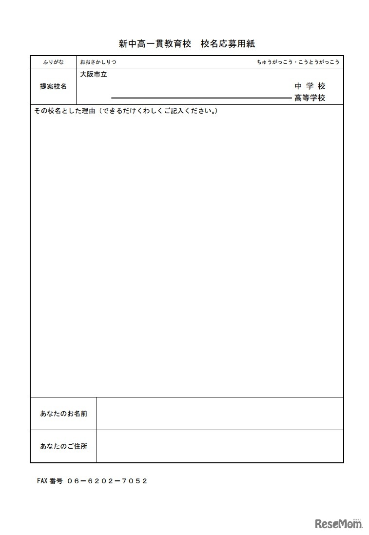 大阪市教育委員会は、2019年4月に開校予定の中高一貫教育校の校名を募集する。漢字またはひらがな、カタカナを使用した、読み方がわかりやすい名称であること。応募資格は誰でも可。募集期間は、7月14日から8月31日まで。