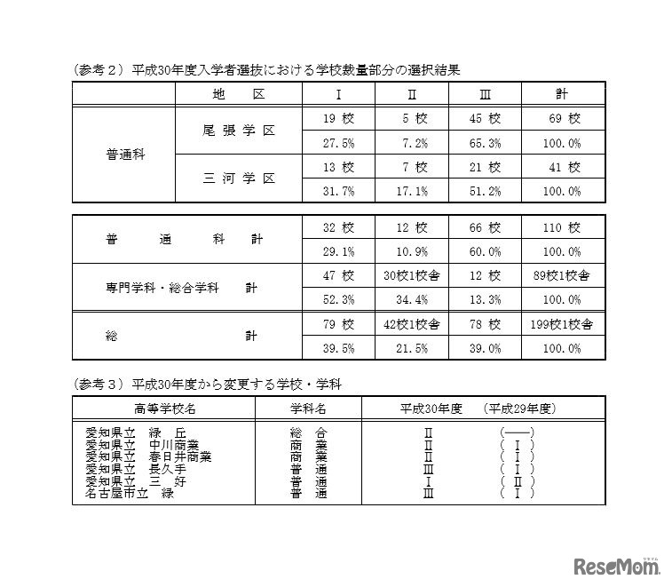 愛知県教育委員会は7月7日、平成30年度(2018年度)公立高校入学者選抜(全日制課程)の一般選抜における各高校の校内順位の決定方法について公表した。調査書の評定得点と学力検査合計点の扱い(学校裁量分)について、各学校の選択を一覧にまとめている。