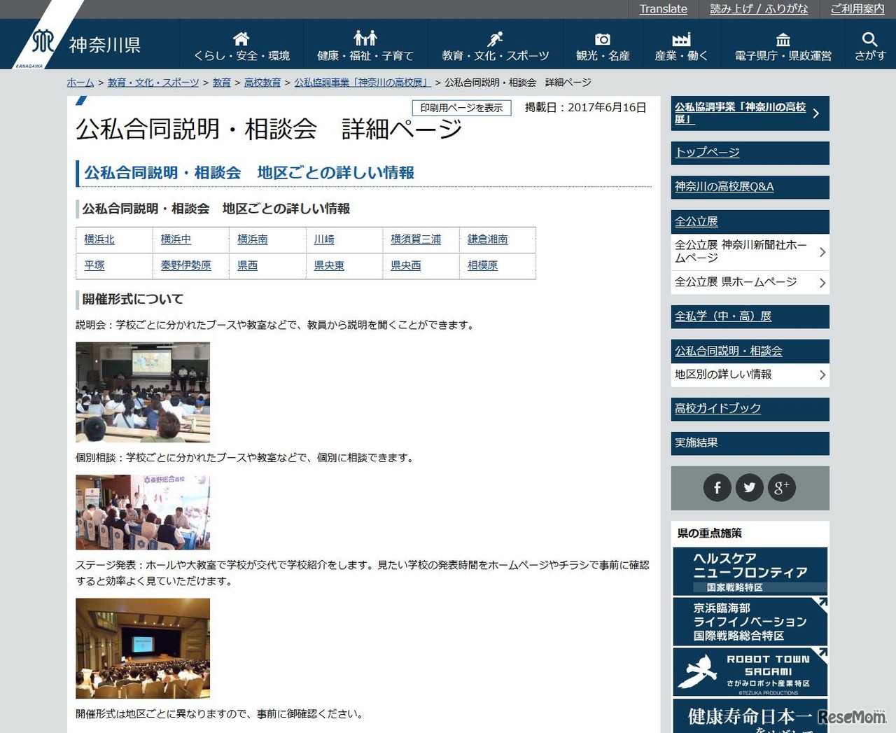 神奈川県内の公立・私立高校が12地区に分かれて参加する「公私合同説明・相談会」が、8月1日から県内の大学や文化会館などの各会場で順次開催される。個別相談ブースで直接先生と話ができるほか、ステージ発表を行う会場もある。入場無料、入退場自由。