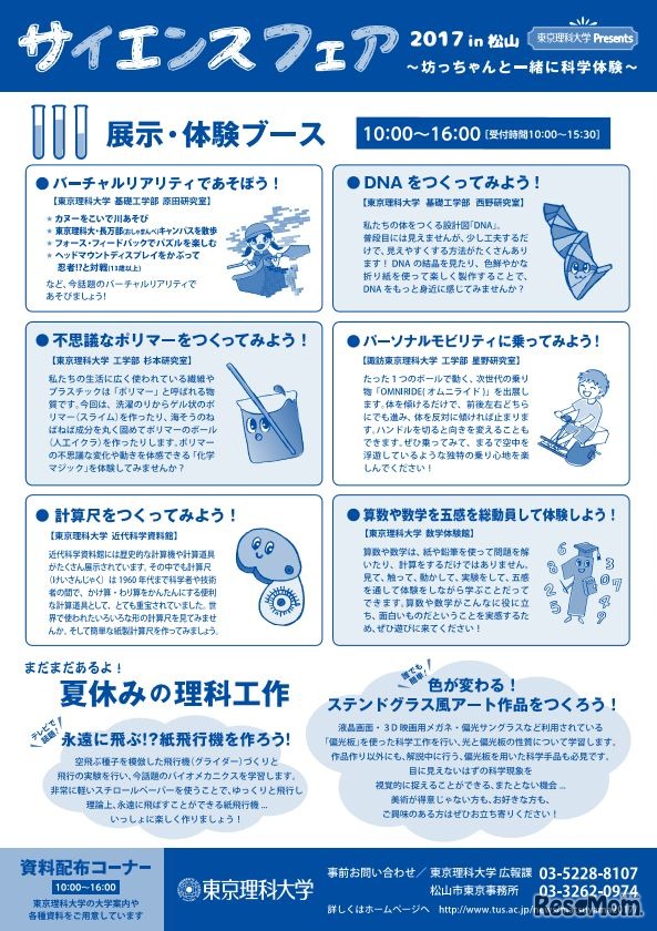 東京理科大学は8月20日、「サイエンスフェア2017 in 松山~坊ちゃんと一緒に科学体験~」を松山市総合コミュニティセンターで開催する。さまざまな研究室による展示・体験ブースが登場するほか、秋山仁教授のスペクタクルショーも行われる。入場無料。