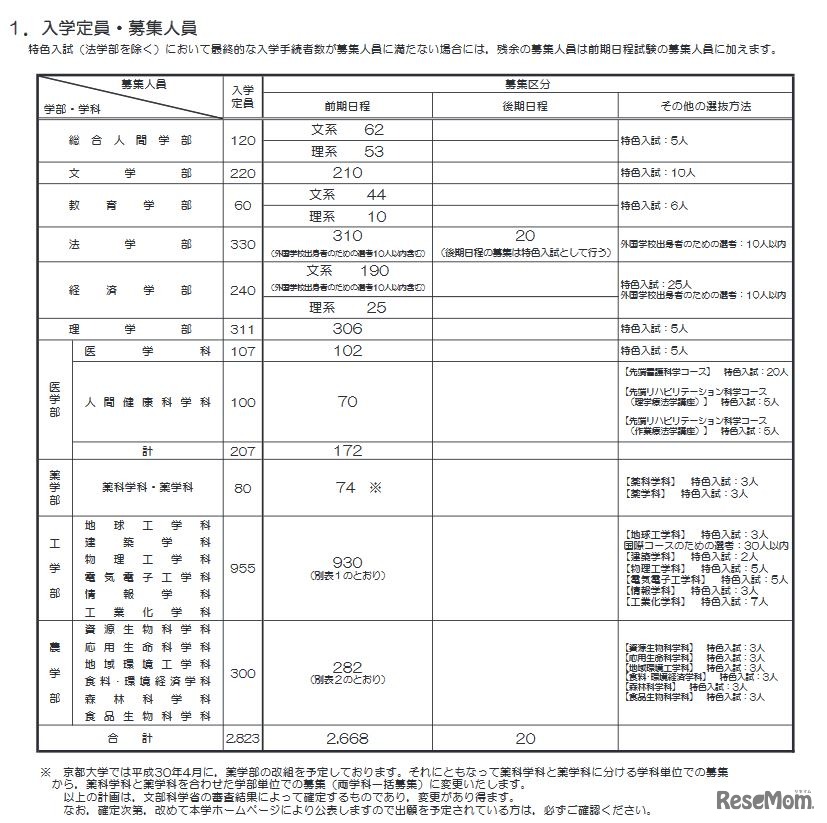 京都大学は7月20日、平成30年度(2018年度)の一般入試選抜要項を発表した。募集人員は、前期日程2,668人、特色入試155人の計2,823人。前期日程は、平成30年1月22日から31日まで出願を受け付け、2月25日と26日に試験を実施する。