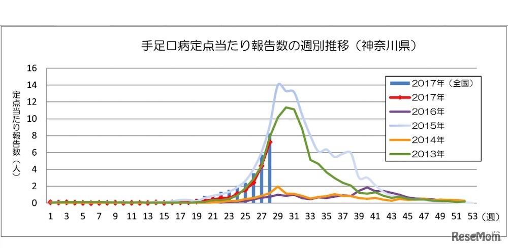 2016年を大きく上回る推移で増加がみられる「手足口病」。第27週(7月3日~9日)に警報レベル超えした東京都に続き、第28週(7月10日~7月16日)には神奈川県と埼玉県が警報発令となった。埼玉県の警報基準値5人を超えは平成27年7月以来2年ぶり。