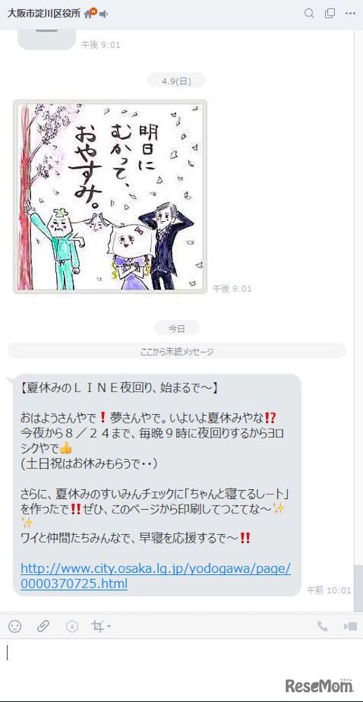 大阪市淀川区が推進する「ヨドネル~睡眠習慣改善の取組~」のオリジナルキャラクター「がんこおやじ 夢さん」が、夏休み期間中の睡眠をセルフチェックできる「ちゃんと寝てるしート」をWebサイトに公開した。恒例のLINE夜回りと合わせて、夏休み中の早寝をサポートする。
