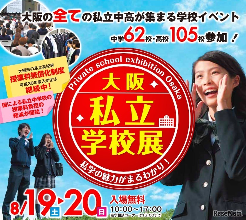 大阪のすべての私立中高が集まる学校イベント「大阪私立学校展」が、8月19日・20日に天満橋OMMビルにて開催される。進学個別相談や制服展示のほか、特別講演会などが実施され、入場料は無料。中学62校、高校105校が参加する、関西最大規模のイベントとなっている。