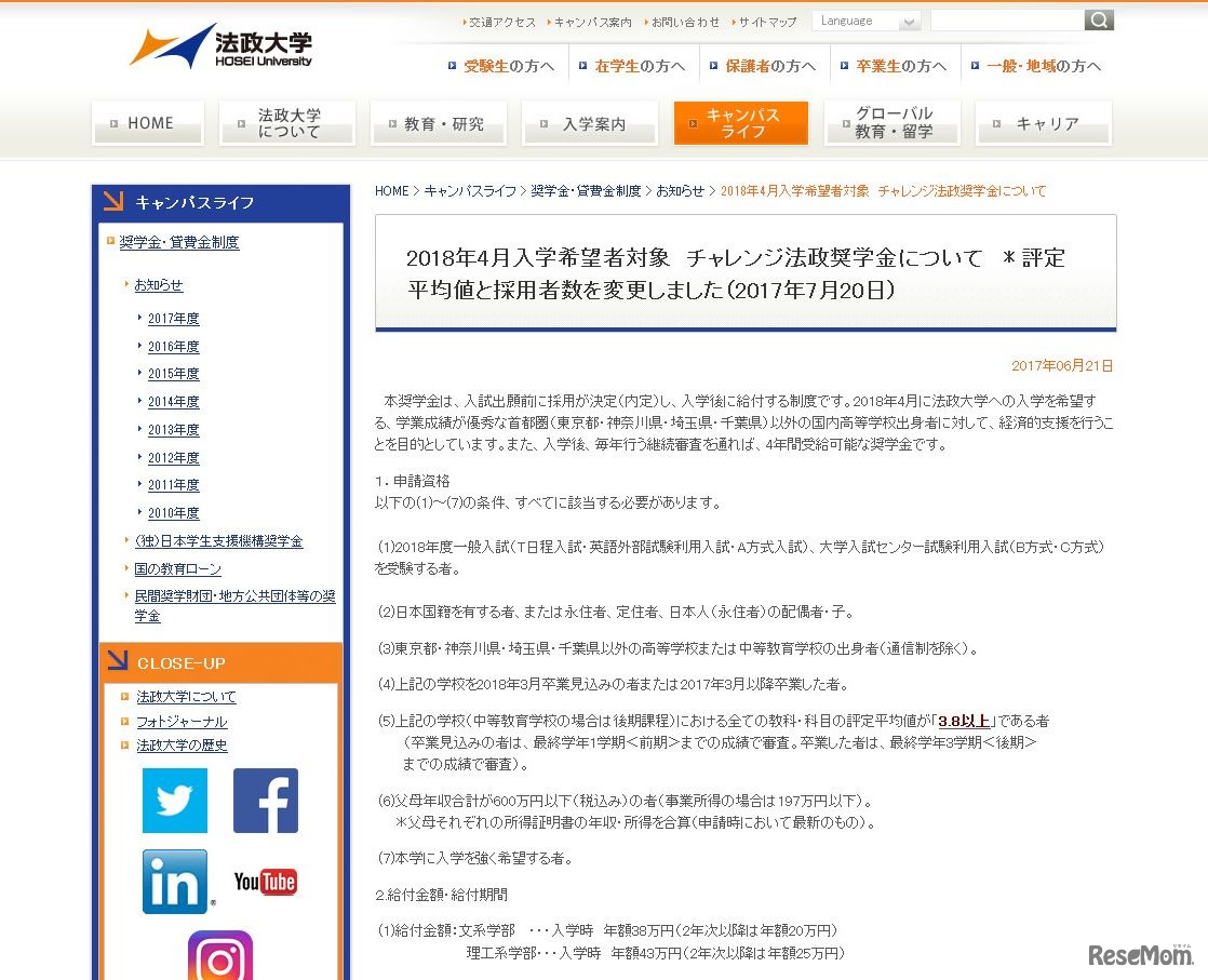 法政大学は7月20日、2018年(平成30年)4月入学希望者対象の独自給付型奨学金制度にかかわる変更内容を公開した。返済不要の給付型奨学金のうち、「新・法政大学100周年記念奨学金」の採用者数と「チャレンジ法政奨学金」の候補者人数を増加する。