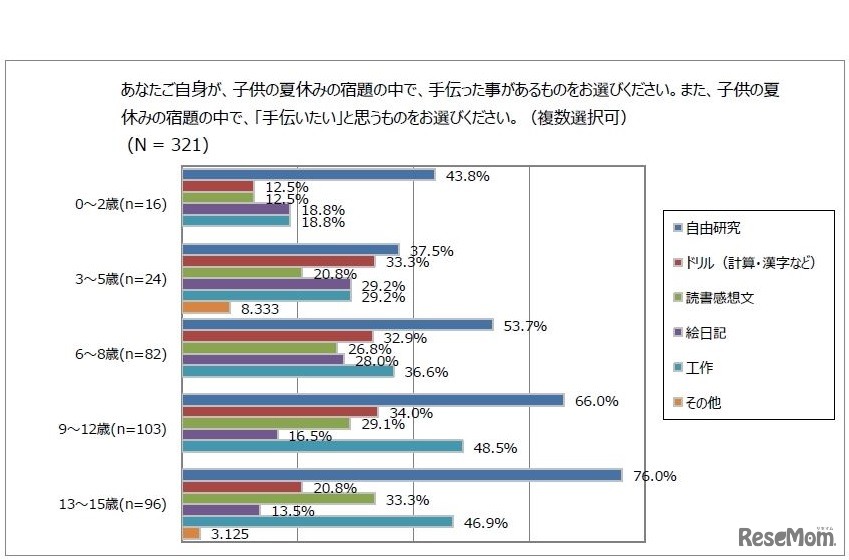 子どもの夏休みの宿題で手伝ったことがある、または手伝いたいもの(年齢別)