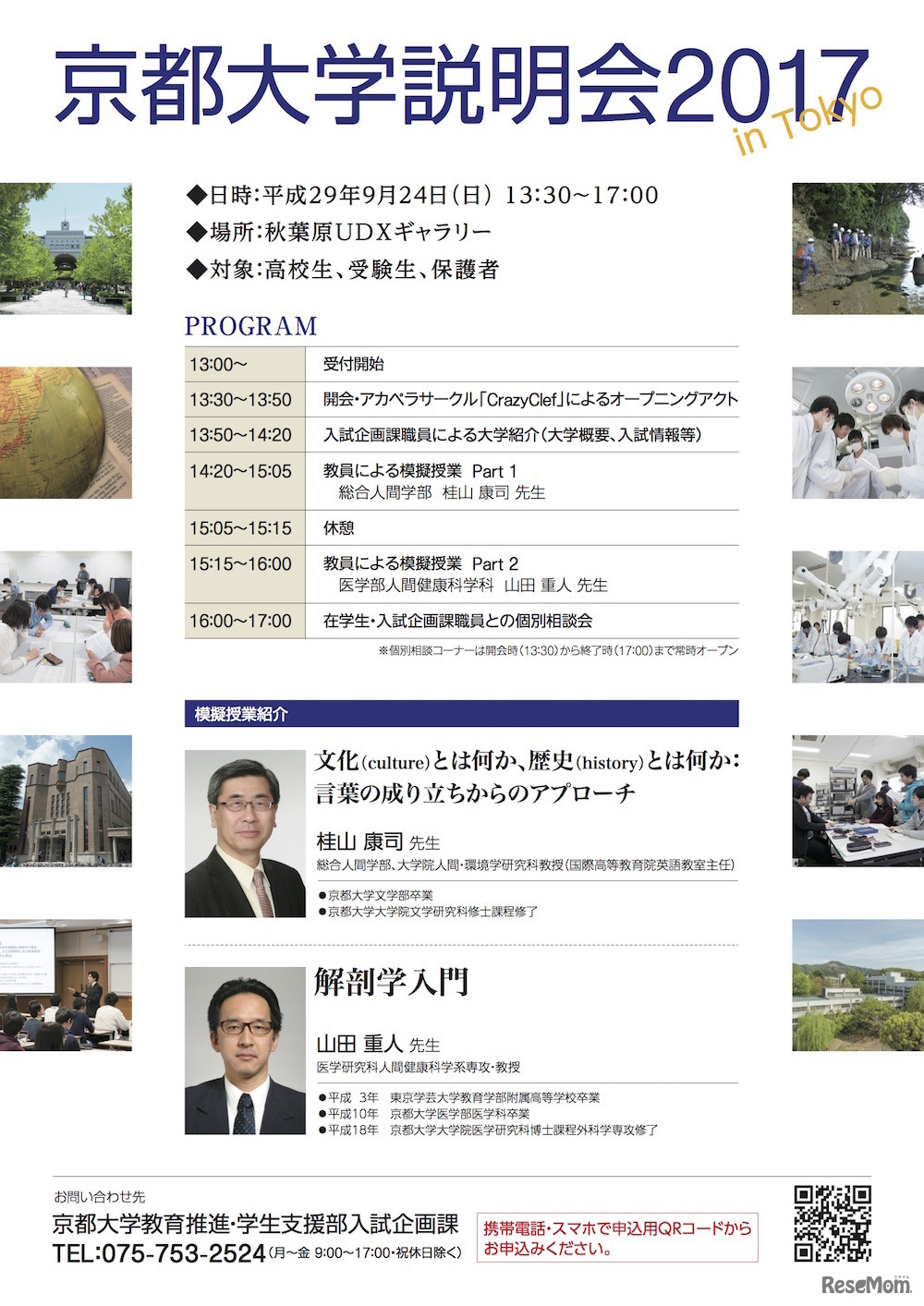 京都大学は9月24日、秋葉原UDXギャラリーにて「京都大学説明会2017 in Tokyo」を開催する。関東周辺出身の在学生を中心に、すべての学部の在学生が参加する個別相談コーナーのほか、大学紹介や模擬授業などを行う。参加費は無料で、事前申込みが必要。