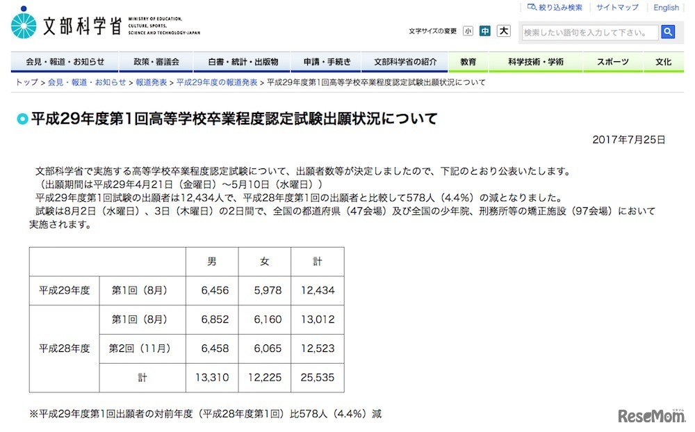 文部科学省「平成29年度第1回高等学校卒業程度認定試験出願状況について」