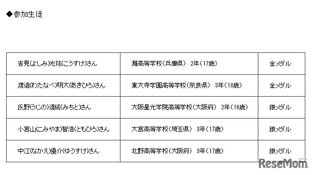 インドネシア・ジョグジャカルタで7月17日より23日まで開催された「第48回国際物理オリンピック」に5名の高校生が日本代表として参加し、2名が金メダル、3名が銀メダルを獲得。参加者全員がメダルを得る快挙を成し遂げた。