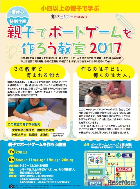 ボードゲームの専門店「すごろくや」は、小学4年生以上の親子を対象にしたワークショップ「親子でボードゲームを作ろう教室」を、7月29日~8月26日の期間に計5回開催する。会場は東京・高円寺の「イベントスペース す箱」。各回定員は10組20名。