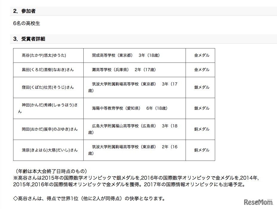 ブラジル・リオデジャネイロで7月12日~23日に開催された「第58回国際数学オリンピック」。日本からは6名の高校生が参加し、金・銀・銅メダルを2つずつ獲得した。金メダルを獲得した開成高校の高谷さんは、得点で世界1位(ほかに2名が同得点)の快挙を成し遂げている。