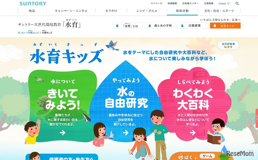 サントリーは次世代環境教育として取り組む「水育(みずいく)」のWebサイトで、「水の自由研究」を紹介している。水をテーマにした実験や調べ学習を掲載しており、夏休みの自由研究にも活用できる。