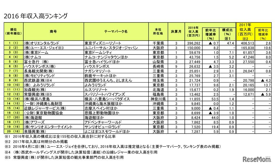 遊園地・テーマパーク経営企業155社の2016年の収入高合計は、前年比1.9%増の約8,360億500万円にのぼることが、帝国データバンクが7月26日に発表した調査結果より明らかになった。地域別では、四国と近畿が2桁の伸び率だった。