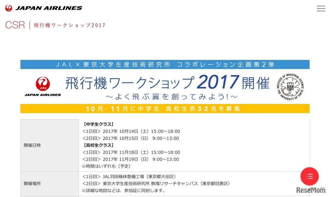 日本航空(JAL)と東京大学生産技術研究所は、中高生を対象とした「飛行機ワークショップ2017~よく飛ぶ翼を創ってみよう!~」を開催する。中学生クラスは10月に、高校生クラスは11月にそれぞれ2日間の日程で開催。各クラス32人を募集する。参加費は無料。