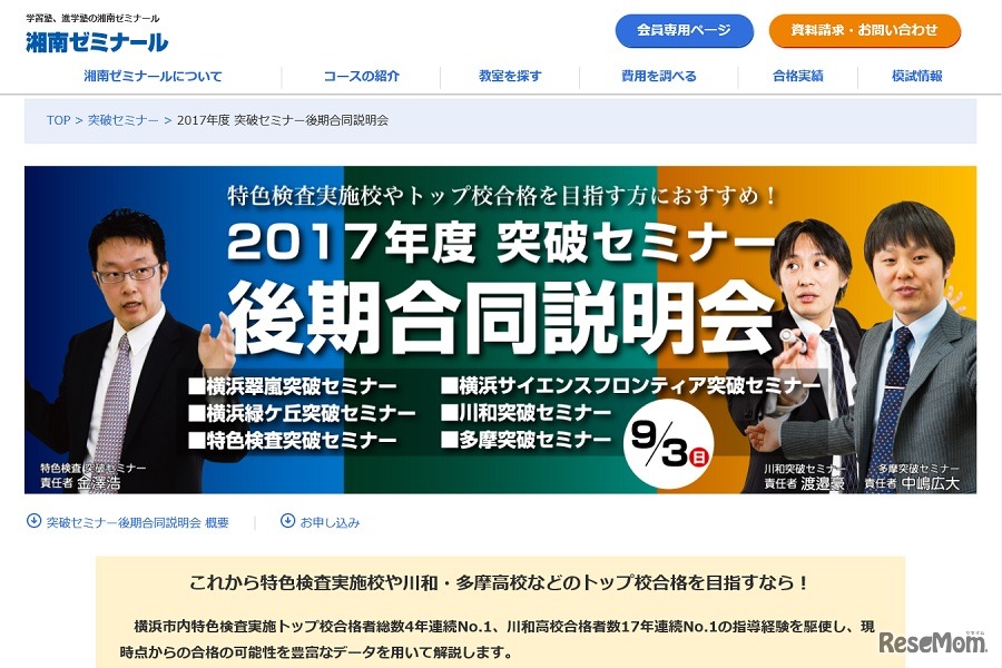 湘南ゼミナールは9月3日、「2017年度突破セミナー後期合同説明会」をSHOZEMI大学進学館横浜校で開催する。中学3年生の保護者が対象だが、子どもとの参加も可能。参加費は無料。Webサイトより申込みを受け付けている。