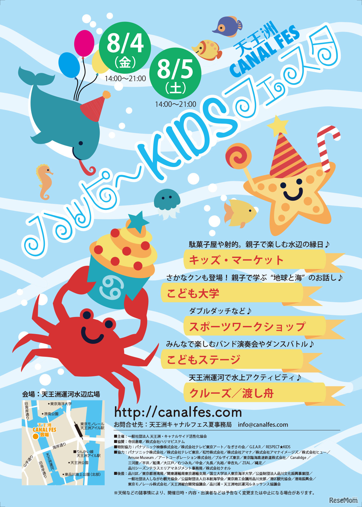 8月4日・5日の2日間、天王洲運河一帯を舞台に「天王洲キャナルフェス2017夏」が開催される。子ども向けの「ハッピーKIDSフェスタ」では、さかなクンなどが講師として登場する「こども大学」や「こどもステージ」など、さまざまなプログラムが行われる。