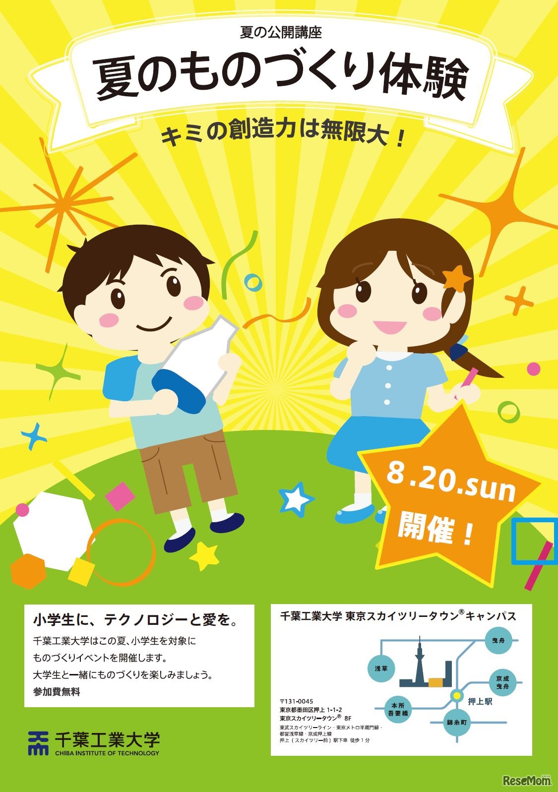 千葉工業大学は8月20日、東京スカイツリータウンキャンパスにて小学生向けの公開講座を開催する。夏と宇宙をテーマにしたワークショップ形式で、大学生と一緒にものづくりを体験する。参加費無料。