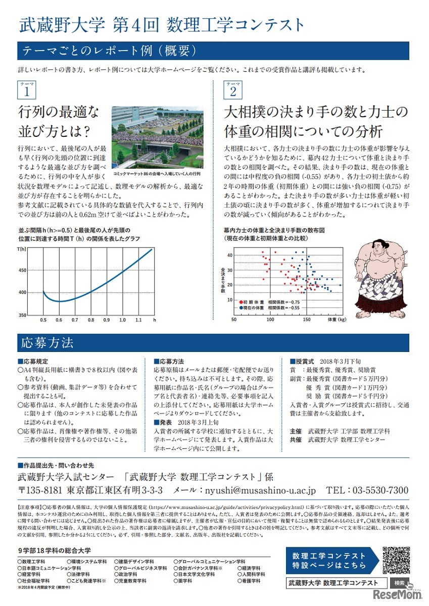 武蔵野大学は、2017年度で第4回目となる「数理工学コンテスト」を開催する。対象は中学生と高校生。なお、コンテストに応募することで、武蔵野大学AO入試の出願資格ともなる。募集期間は2017年9月1日から2018年1月31日まで。