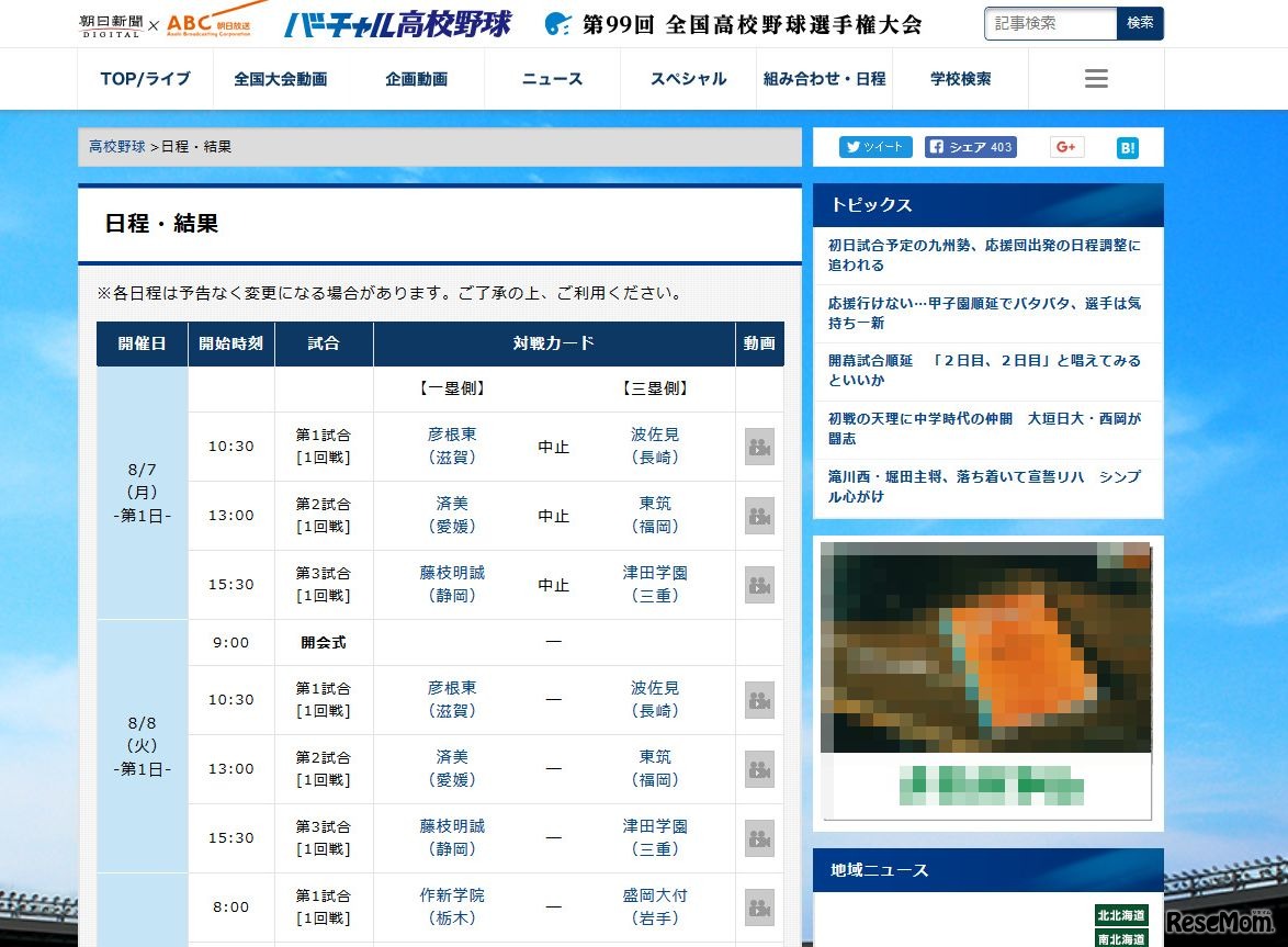 8月7日に予定されていた第99回全国高校野球選手権大会(夏の甲子園)の開幕。接近する台風5号の影響により、8日への順延となった。よって、開会式は8月8日(火)午前9時から、彦根東と波佐見による開幕試合は同午前10時半から。