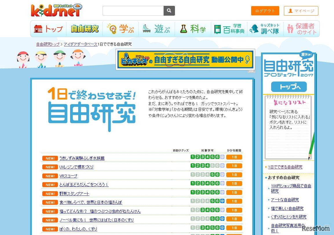 学研プラスが展開する学研キッズネットは、これから自由研究を頑張る小中学生のために1日でできる自由研究特集「1日で終わらせるぞ!自由研究」を公開している。対象学年別の目安を設け、研究によっては動画解説も用意している。